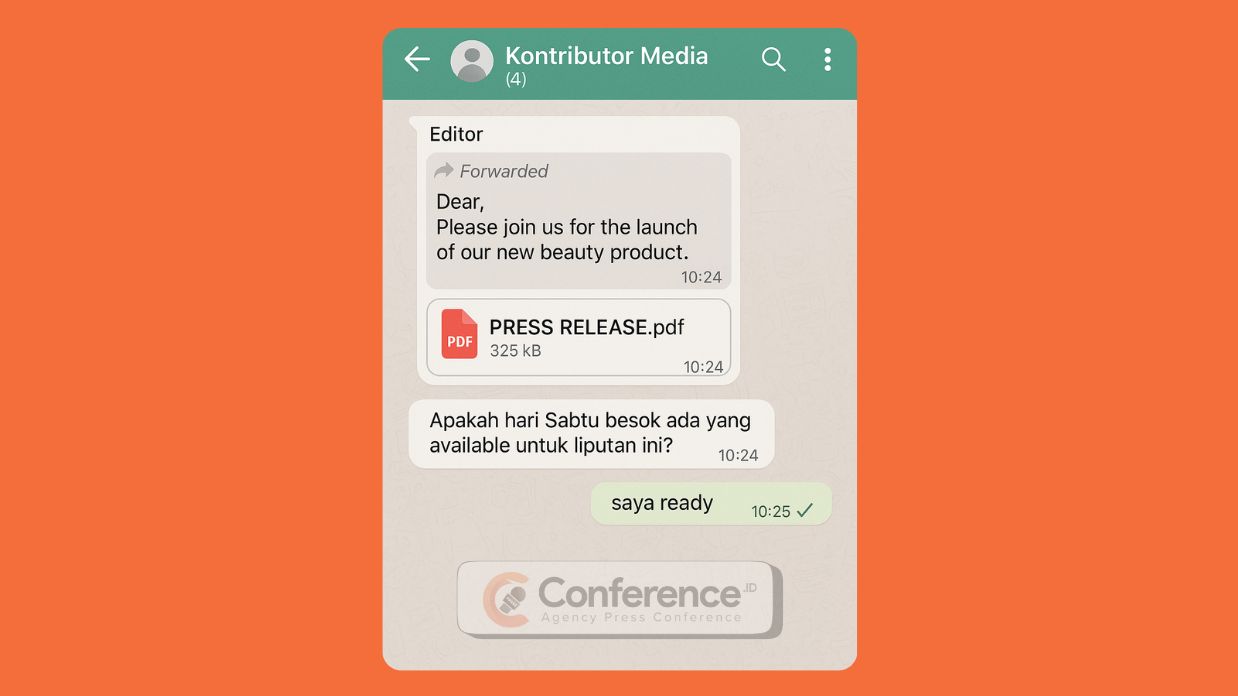 “Halo [Nama Wartawan], saya [Nama Anda] dari [Perusahaan]. Pada [Tanggal] kami akan mengadakan acara peluncuran produk baru di [lokasi], jam [waktu]. Info lengkapnya saya lampirkan di sini, ya. Apabila [Bapak/Ibu] berkenan hadir, kami sangat menghargai. Terima kasih sebelumnya.”